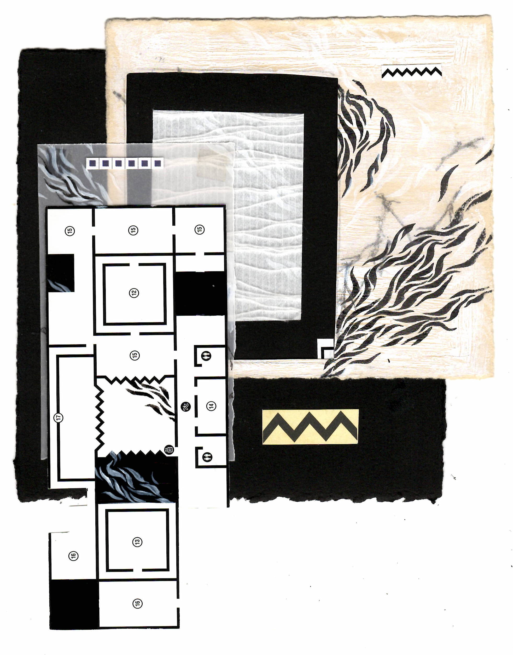 These collages are composed of drawn-on ‘scraps’ and personal ephemera including museum pamphlets, readings and scraps. It speaks to a feeling of constriction while navigating institutions as an artist. Using methods inspired by black-out poetry, fragmenting and tearing, I am interested in erasure and the loss of individuality, due to isolating modern structures.