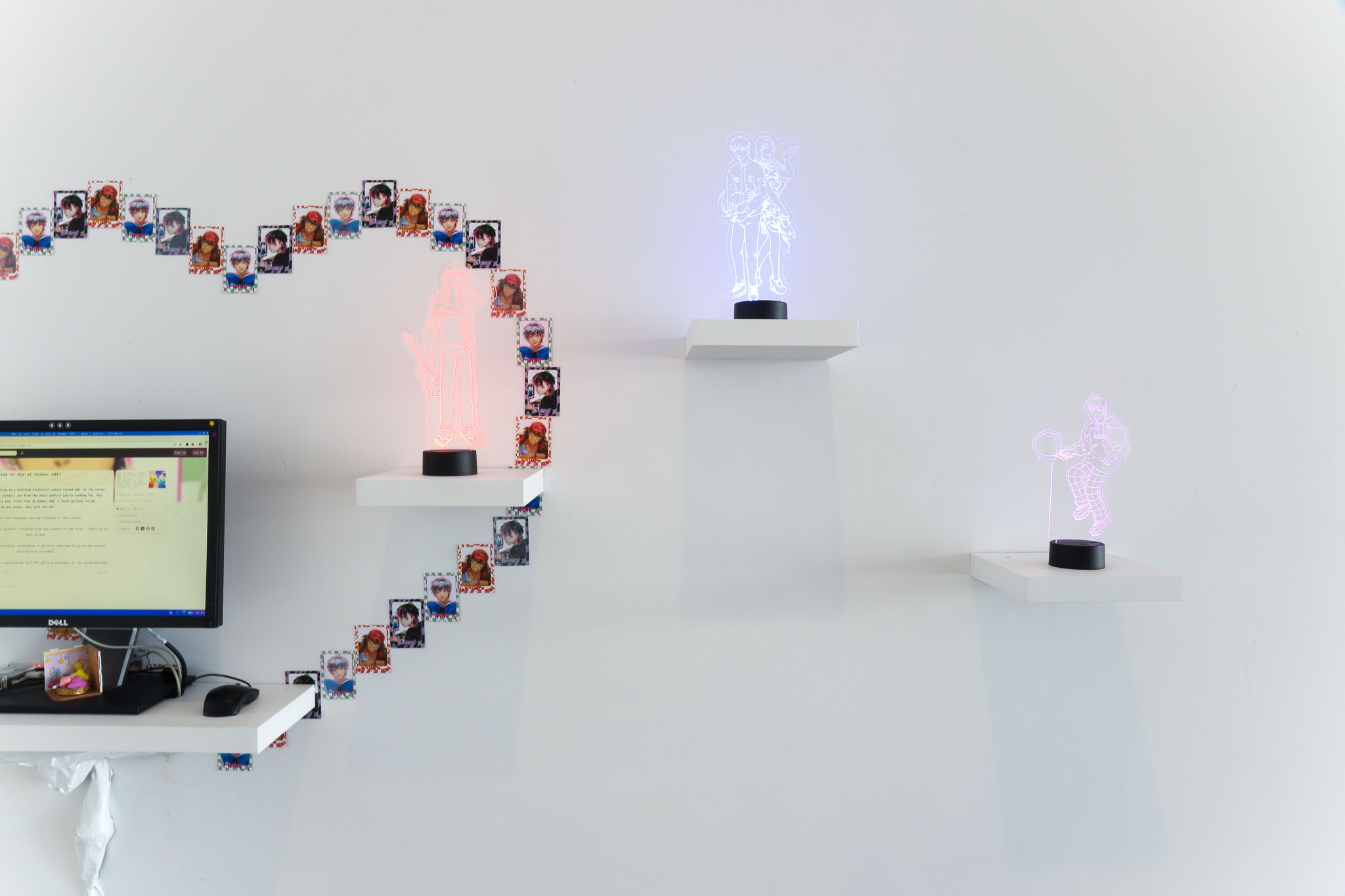 Creating characters based on the 3 other exhibiting artists, this work toys with the fuzzy line between fiction and reality. Styling them as bishounen (Japanese for beautiful youth), they traverse between fan-made media modelled on otome games (dating simulator made for women-centric audience), Kpop idol magazines and collectibles, referencing a plethora of fan cultures and possibilities.