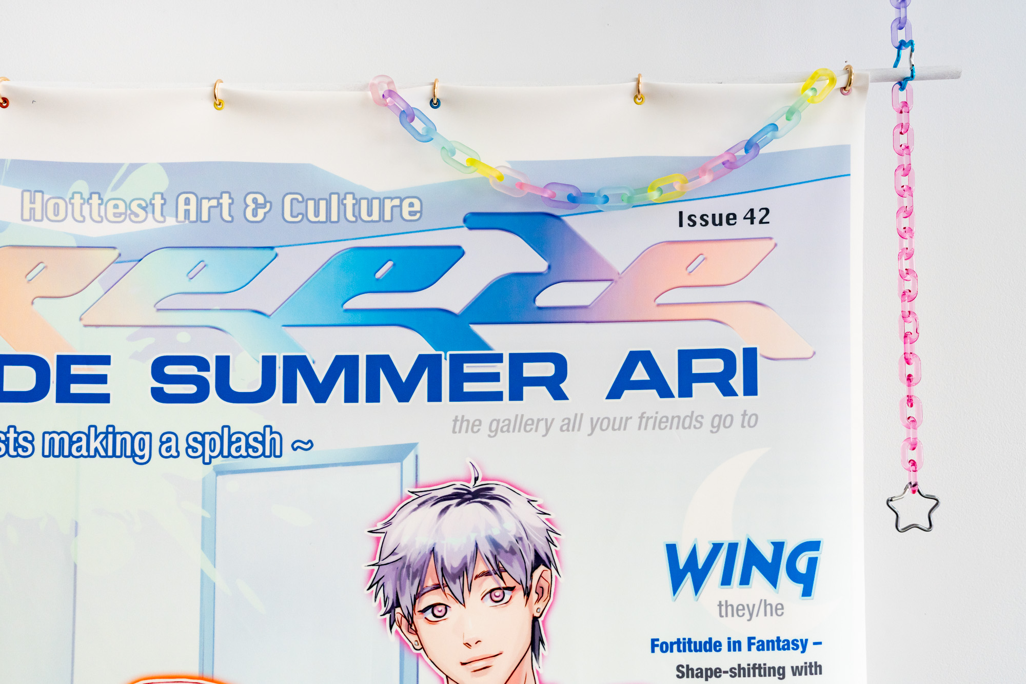 Their story is set in a fictional gallery, Summer ARI, inspired by the artist’s experience at Pari, an artist-run gallery on Dharug land (Western Sydney). The title references the name that almost was, ‘10 degrees Hotter’, which some thought it sounded like a boyband. Summer, a trope that evokes youth, euphoria and fleetingness. Enveloping the world of Summer ARI is a rose-coloured lens that highlights the romance of collectivity.